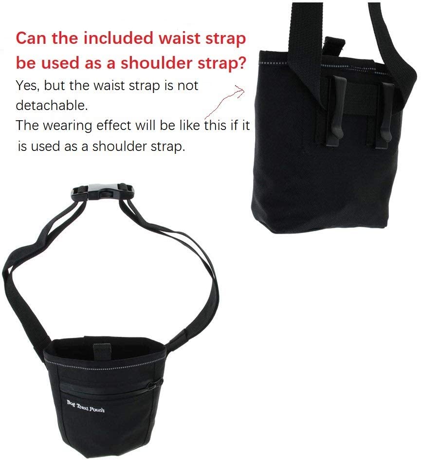 Wear with adjustable Belt (included) or with Clip. 【 NOTE: The waist belt is NOT detachable. 】The max length (full length) of the belt is around 50-inch (130 cm). The Dog Bait Bag / Dog Training Pouch is a very well-made that you will love for years!