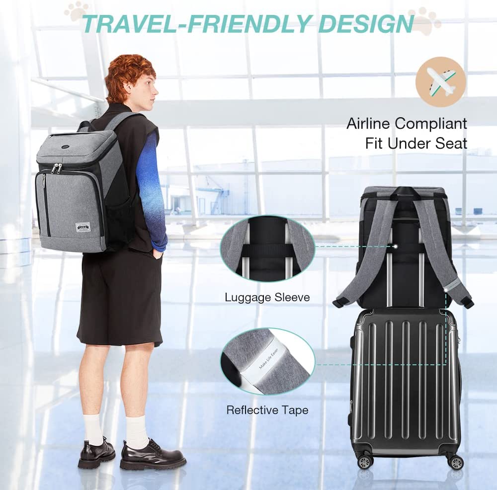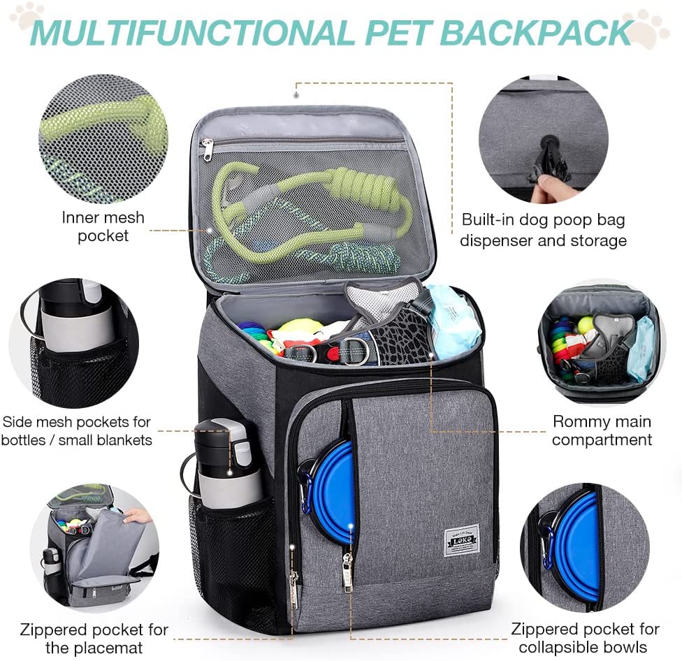Roomy Capacity: This pet travel bag backpack measures 11.8 x 7.9 x 16.5 inches (LWH) with bag volume of 25.2L in total. A large main compartment to store dog treats, leashes, toys and more, while multiple functional pockets to keep dog supplies and your stuff organized.