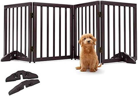 STABLE AND STURDY: This freestanding pet gates for dogs is designed with an attractive wooden surface and sturdy non-slip rubber feet that are very stable and strong when used with the support feet, and will not cause potential damage to your home. This versatile wooden dog gate is a pet enclosure, room divider, and dog gates all in one to meet all aspects of your scenario!