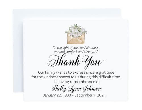 PERSONALIZATION: Cards are personalized with your loved one’s name and life dates in the ink color of your choice. You may also add a printed message inside and return address printing to your envelopes.