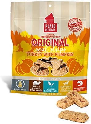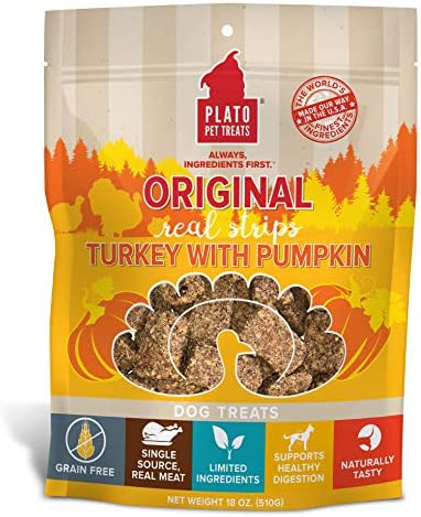 Real Strips Grain Free Turkey With Pumpkin are soft textured, meat bars that support healthy digestion and are just the right portion size and shape for chomping. Made with real turkey as the 1st ingredient, these treats are grain free, made with limited ingredients, are naturally preserved, and contain no artificial flavors, corn, wheat, or soy. They are easy to chew as is or can broken into smaller pieces for dogs of all sizes. And we take the extra time to air-dry them in batches in our USA facility instead of baking them in order to retain more of the ingredients’ inherent nutrients (but your dog will just think that they smell and taste amazing). It takes longer, but we think its worth it. Real Strips Grain Free also come in Turkey With Sweet Potato and Turkey With Cranberry.