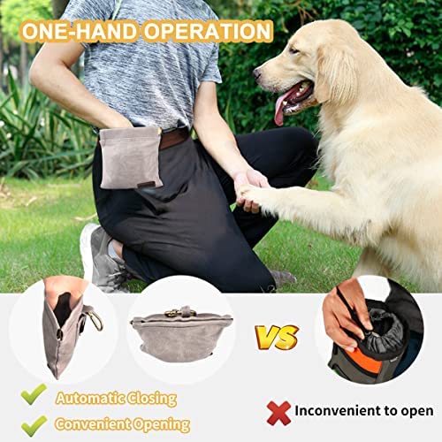 ????【ONE-HAND OPERATION】This dog treat bag is designed with a self-closing opening that is easy to access and ensures no spillage, allowing you to easily access your pet’s treats when you need them.