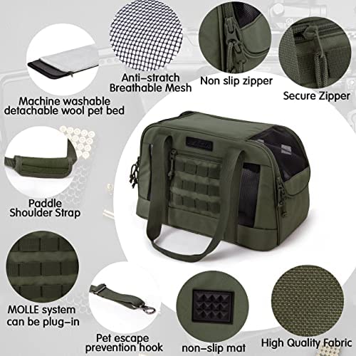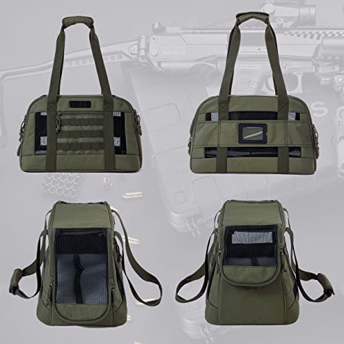 DESIGN: Tactical style Molle design cat carrier.One front pocket of small animal carriers is convenient to carry pet food, removable and washable lamb wool comfortable bottom cushion, multi-directional mesh design, one side entrance and the other side exposed design, breathable and comfortable, easy to observe pets